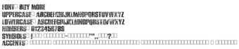 Buy More, cesur ve dokulu bir yazı tipi olup, kentsel enerjiyi yansıtır. Tüm harflerin büyük ve ağır yapısı, yıpranmış posterler veya damgalı tabelalar görünümünü andırarak dikkat çekici bir ifade oluşturur. Yazı tipinin kaba ve düzensiz dokusu, ona el yapımı bir his kazandırırken, vintage endüstriyel cazibesini de artırır. Farklı stiller arasında, daha sağlam ve bloklu tasarımlardan, derinlik ve hareket hissi veren yüksek derecede aşınmış, katmanlı versiyonlara kadar geniş bir varyasyon sunar.